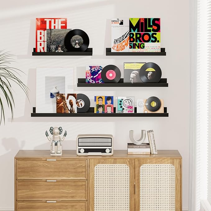 Heimlove Floating Shelves Set of 6, 16" Wall Mounted Picture Ledge, Display Shelf Organizer for Decor Storage, Wall Mounted Shelves for Living Room, Bedroom, Bathroom, Kitchen (Black)