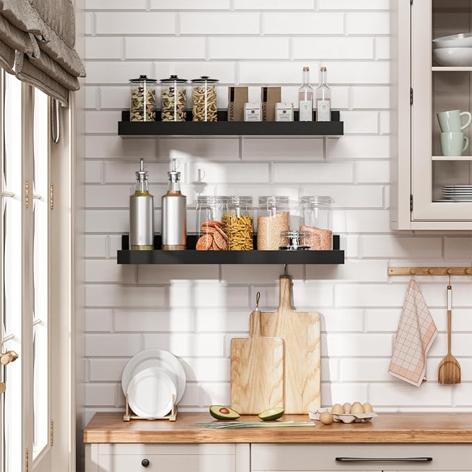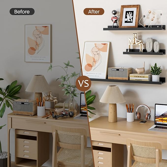- 【Durable wall mounted storage rack】These shelves are made of high-quality engineered wood, which is very sturdy and can be securely installed on walls. Each shelf can hold up to 22 pounds of products for display. The dimensions are 16 inches long, 4.8 inches deep, and 1.6 inches high, providing a practical solution for wall finishing while complementing any decorative style and seamlessly integrating into any space, from modern to traditional, from rural to contemporary.
