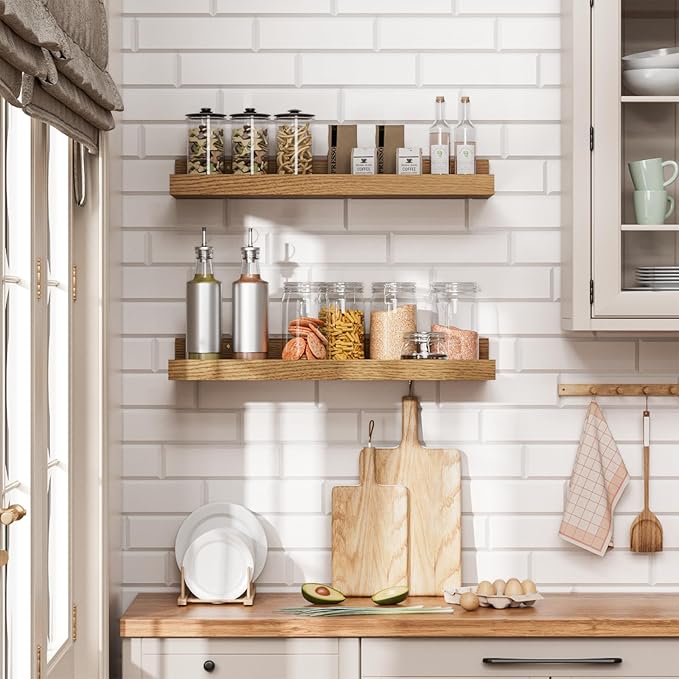 - 【Durable wall mounted storage rack】These shelves are made of high-quality engineered wood, which is very sturdy and can be securely installed on walls. Each shelf can hold up to 22 pounds of products for display. The dimensions are 16 inches long, 4.8 inches deep, and 1.6 inches high, providing a practical solution for wall finishing while complementing any decorative style and seamlessly integrating into any space, from modern to traditional, from rural to contemporary.