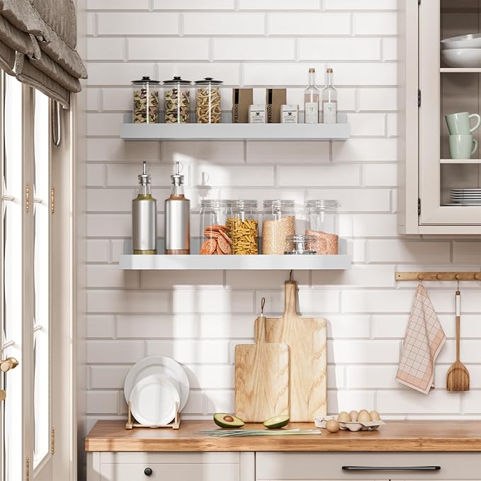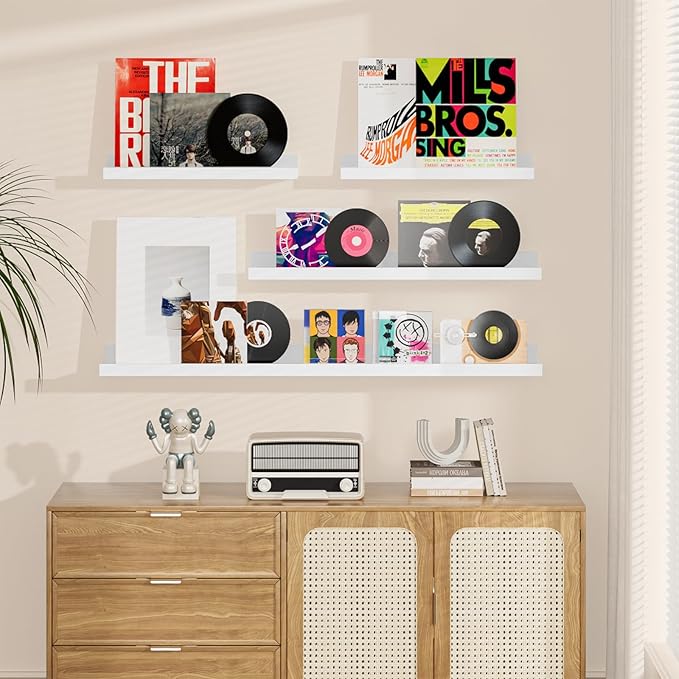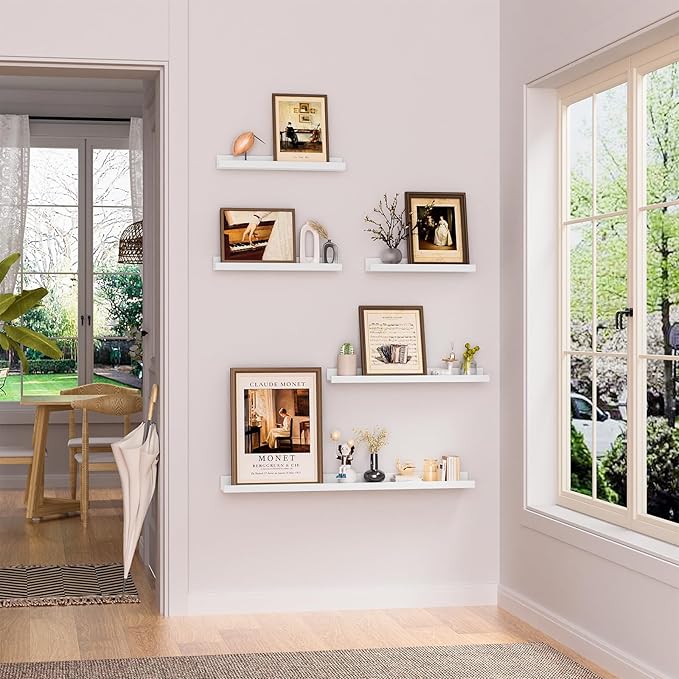 Heimlove Floating Shelves Set of 6, 16" Wall Mounted Picture Ledge, Display Shelf Organizer for Decor Storage, Wall Mounted Shelves for Living Room, Bedroom, Bathroom, Kitchen (White)