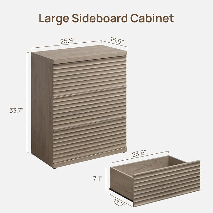 - 【Roomy Storage Space】The overall dimensions of the sideboard cabinet are 15.6"D x 25.9"W x 33.7"H, and each drawer measures 13.9"D x 23.6"W x 7.1"H, allowing it to accommodate various items with little effort. The 1.38” thick boards on the top and bottom not only provide good support, but the wide top can also hold a coffee maker, cups, decorations, and commonly used items
