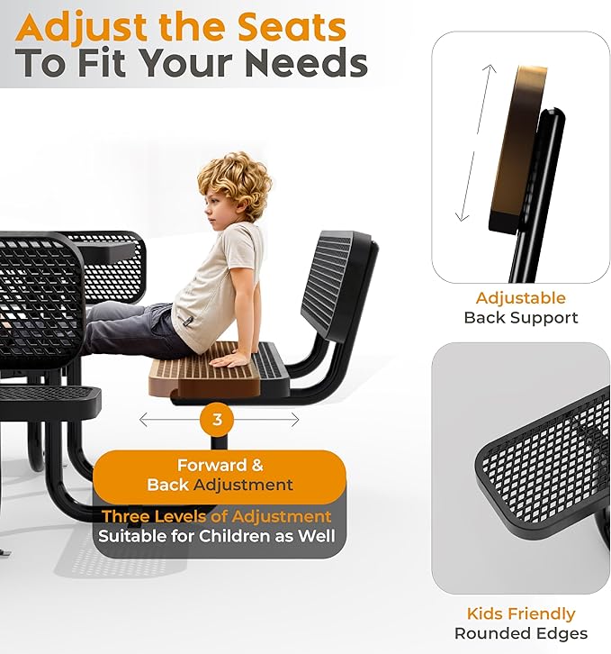 - Customizable Seating Position and Backrest: Provides comfort for the whole family, ensuring everyone has the perfect fit. This table features three distinct seating positions, allowing you to easily set the seats closer for children or further apart for adults. The backrest can be installed or not, it's up to you. Additionally, you can adjust the back to be upper or lower.