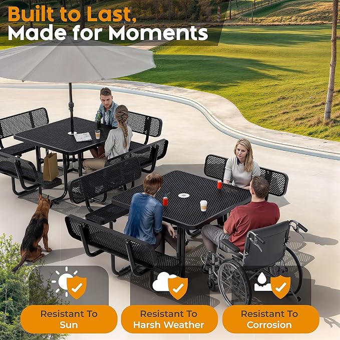 - Designed for Decades of Outdoor Use: Square outdoor picnic table crafted from industrial-strength steel and thick coated in thermoplastic for rust-free, long-lasting quality. Sturdy steel frame with powder-coat finish resists harsh weather, making it the definition of a weather proof table.