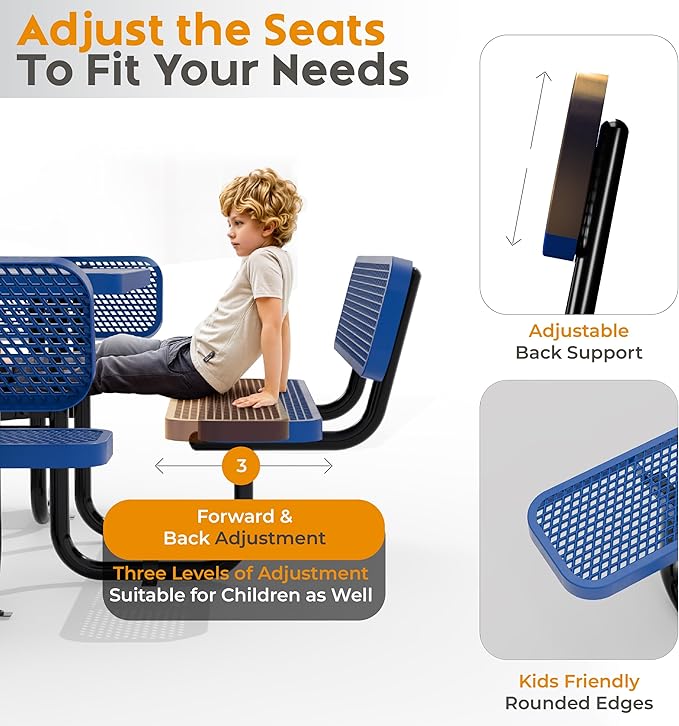 Metal Picnic Tables for Outdoors with Umbrella Hole - Coated Steel Heavy Duty Commercial Grade Furniture with Adjustable Seats (Blue, 46 in, Square with Back, Expanded Steel)