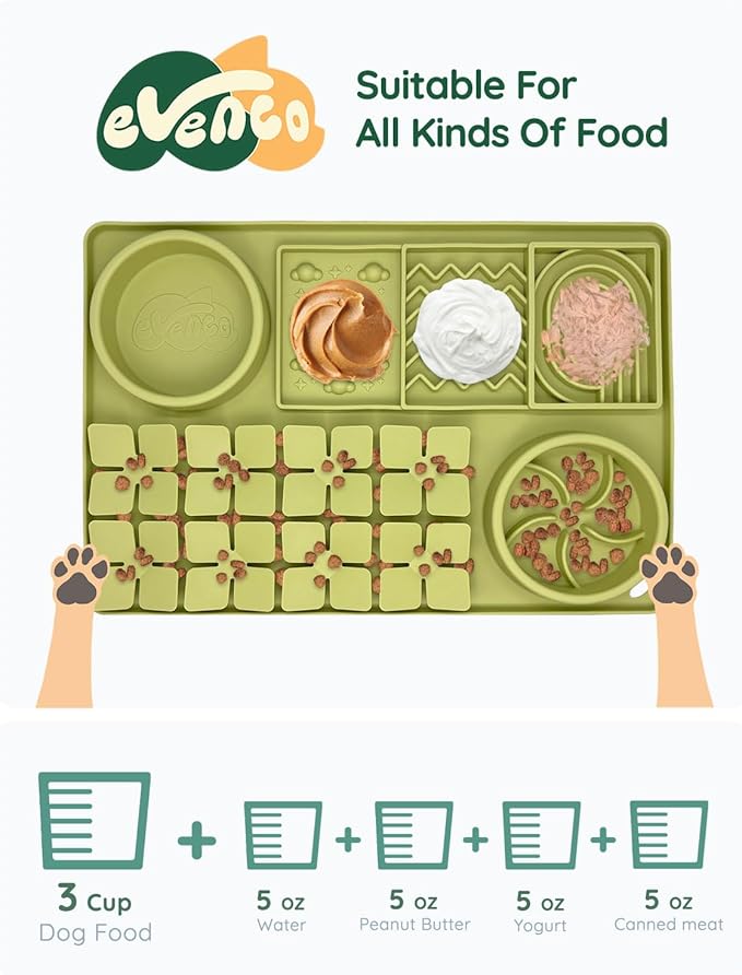- UPGRADED 4-IN-1 FEEDER: Our multifunctional slow dog feeder includes a slow-eating bowl, a dry food bowl, a snuffle area for mental stimulation, and a lick mat with 3 patterns. Ideal for enhancing the lives of dogs and cats, and a thoughtful gift for a multi-pet family.