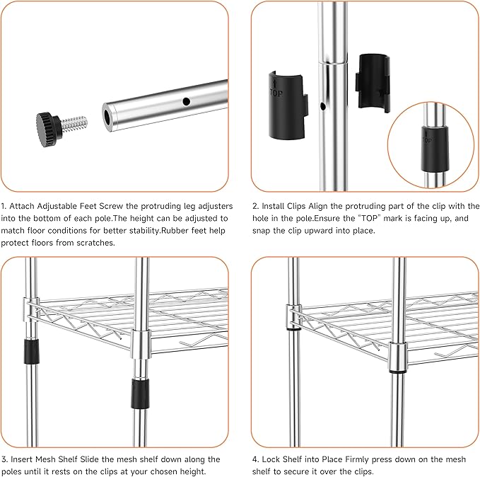 - Strong & Durable: Built with high-quality carbon steel, this 4-tier wire shelving unit offers reliable strength and long-term durability. Perfect for organizing kitchen supplies, office essentials, or household tools.