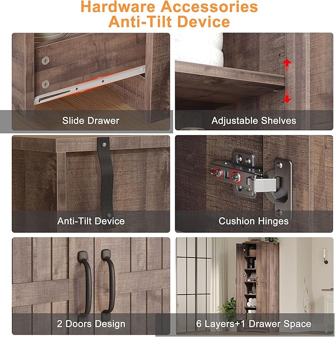 - High Density Material & Size: Our storage cabinets are made of high-density durable MDF/PB composite board composition, high density of wood fibers, uniform composition, not easy to splinter or crack, high-quality hardware fittings for handles to bring stability; The size of the pantry cabinet: 15.35"D x 25" W x 70"H, with 6 adjustable shelves and a sliding drawer, extra large capacity is perfect for home storage