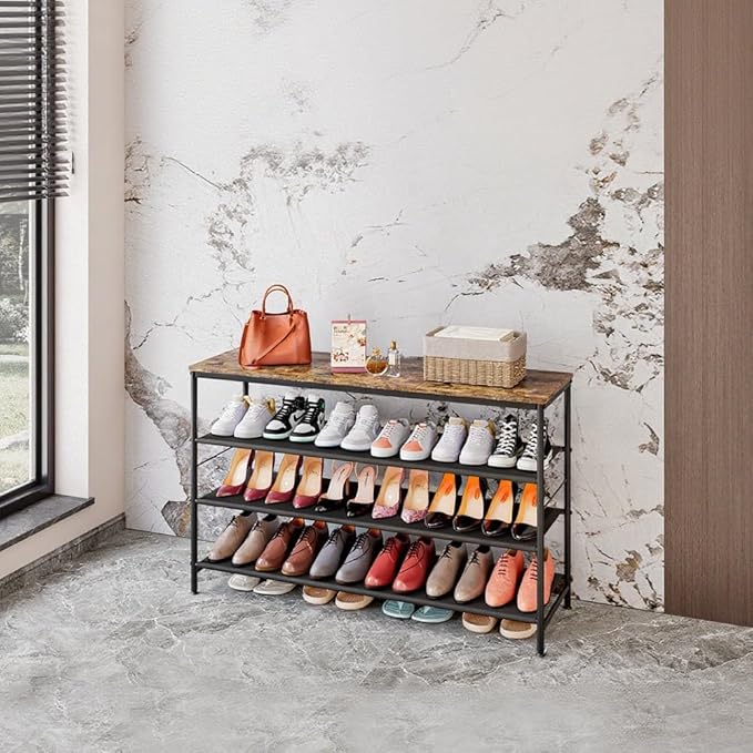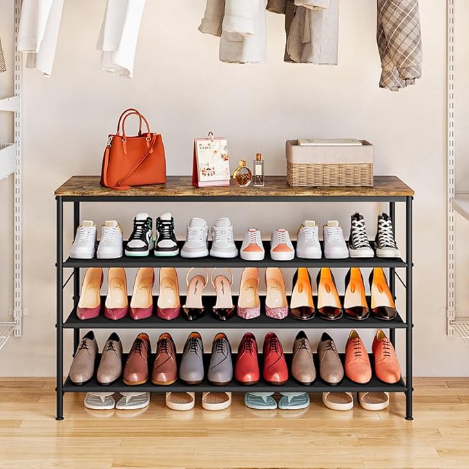 Shoe Rack Organizer 4 Tier Long Metal Organizer Shelf with Industrial MDF Board and Layer Fabric for Entryway Closet Bedroom Living Room Garage,Black & Rustic Brown