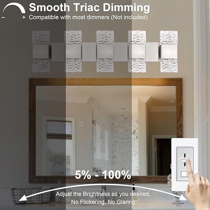 - Energy Saving & Smooth Dimming: This 40W led vanity light saves up to 80% electricity compare to conventional light bulbs and lifespan up to 50,000hours. The modern led bathroom lights compatible with most LED dimmers on the market (not included), allows you to adjust the LED light output luminance