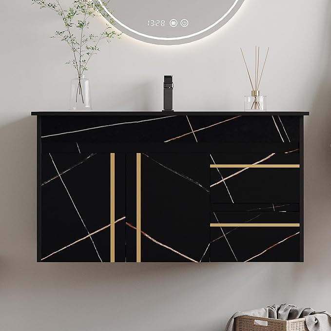 - Wall Mounted Bathroom Vanity with Sink: Floating design makes this bathroom vanity allows to mount at any height. Wall mount design not only save space for your bathroom, but also is easy for cleaning water on floor.