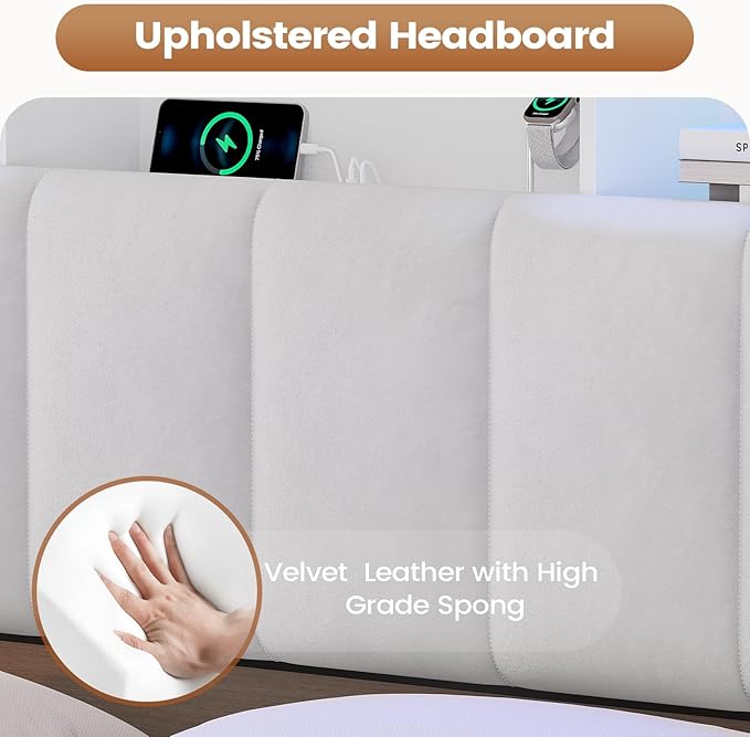 - 【Full Size Bed Frame with Charging station】The bed frame with storage headboard is equipped with charging station,and it includes: 2 AC outlets and 2 USB ports; which make it super convenient to charge your phone or tablet right by your bedside at night while you are laying on the bed.