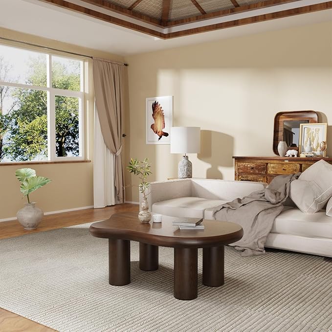- CLOUD-SHAPED DESIGN: The modern coffee table is cute and cloud-inspired, with minimalist lines matched with round legs, which adds a sense of whimsy and funkiness to your living space. Moreover, it flaunts a sleek, warm walnut finish that goes well with any decor style.