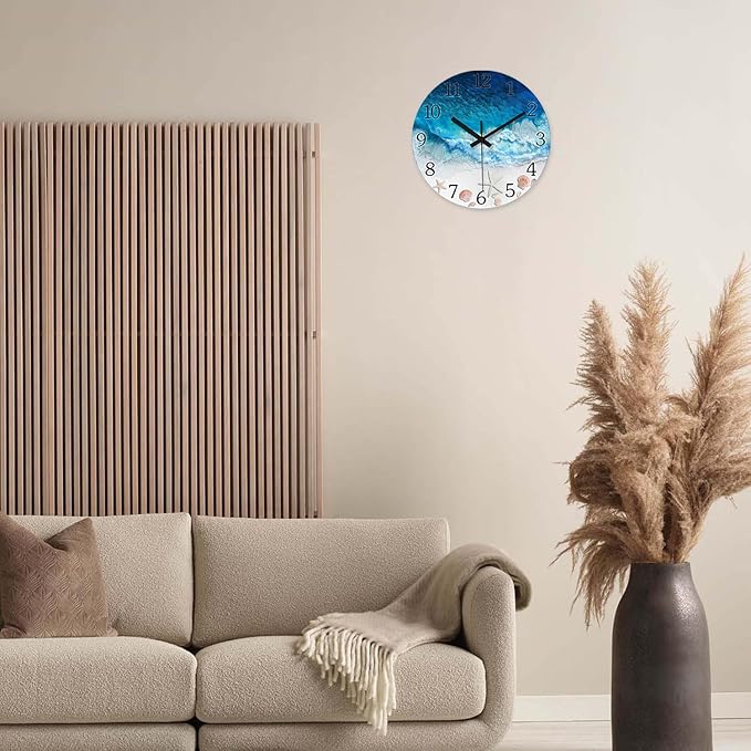 - 1.[Size] - The beach wall clock is 12 inches x 12 inches,HD glass wall clock,frameless analog wall clock,round wall clock for bedroom,decorative wall clocks for living room,small wall clock for bathroom,quiet wall clock for office,coastal wall clock for kitchen.