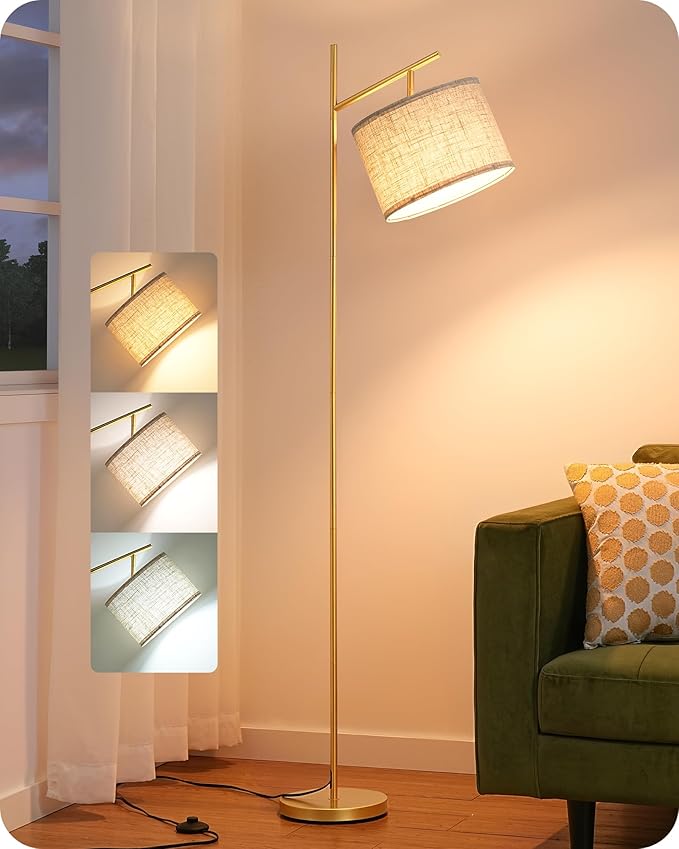 EDISHINE 64.7" Modern Minimalist Floor Lamps for Living Room with 3 Color Temperatures Bulb & Adjustable Linen Shade, Foot Pedal Switch, Tall Standing Lamp for Bedroom Office, Gold