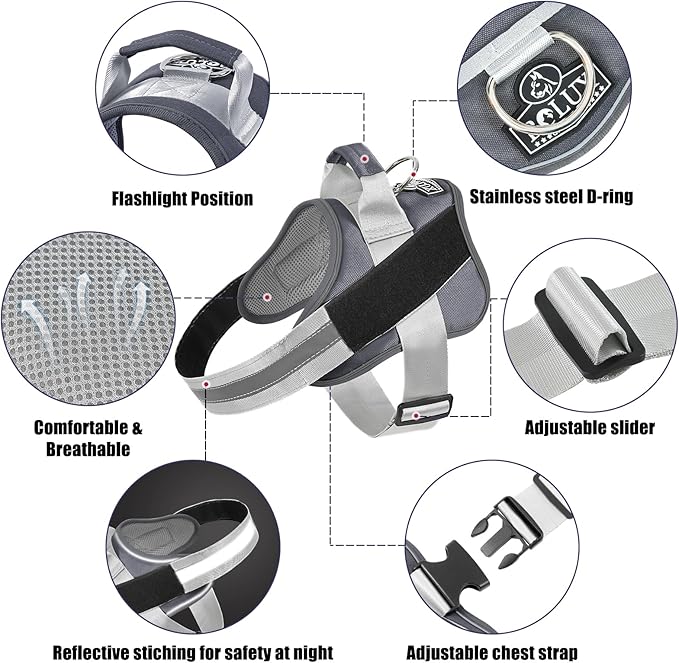 - SUPER COMFORTABLE: Bolux no choke dog harness pulling pressure is evenly distributed to the body to prevent pulling and choking. The dog vest harness have a adjustable chest strap with snap on buckle, move its body parts freely, can customized fits for your puppy growth do not need to always change it.