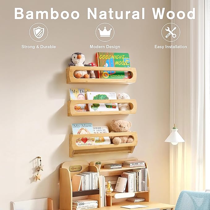 - [Space-Saving & Versatile] Floating wall shelves that free up floor space and ideal for small nurseries, kids’ rooms, and playrooms—perfect for organizing books, toys, and nursery decor. Also useful in bathrooms or kitchens. Their versatile design adapts to any room’s decor.