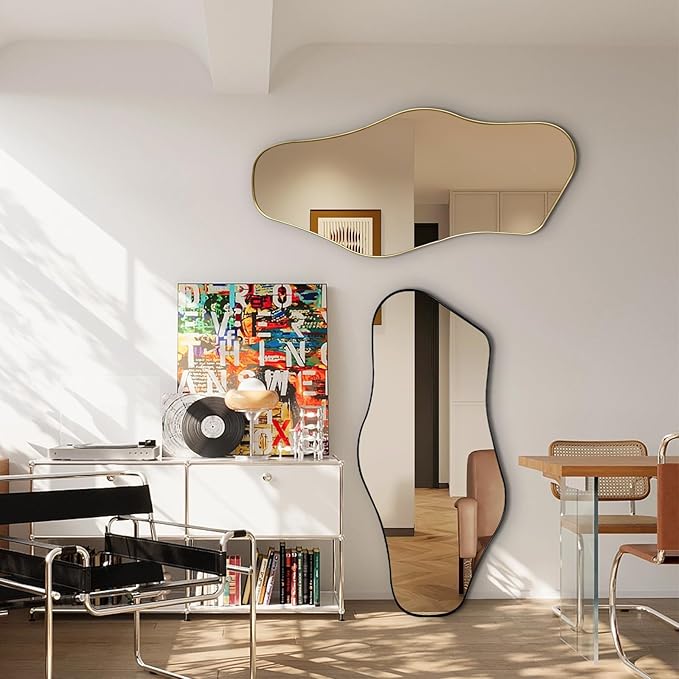 - Various Size: Irregular shaped mirror are available in 40"x18", 47"x25", 55"x25.6", 63"x29". This asymmetrical mirrors frame is made of iron. It is both practical and fashionable