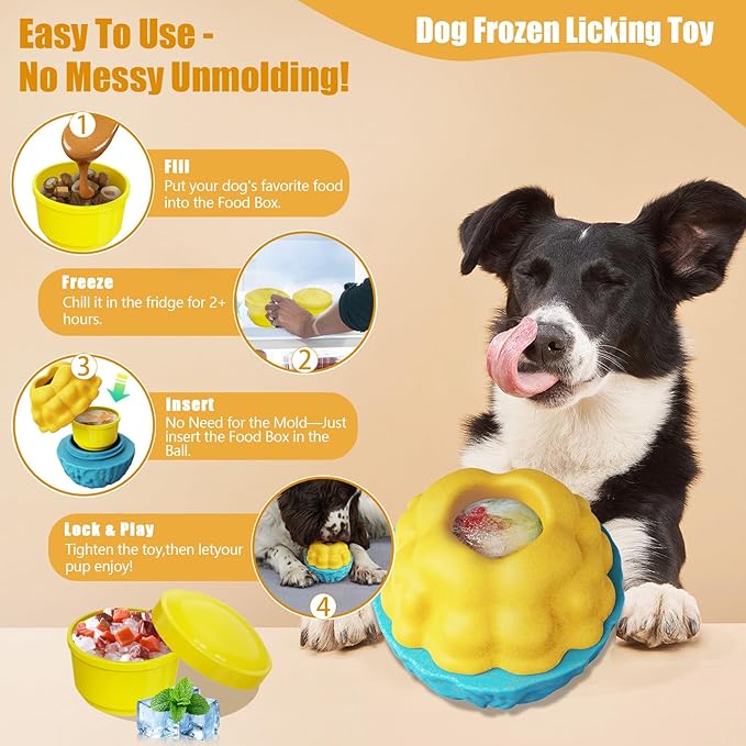 - 【Easy to Use-Dog Freezer Toy】Effortlessly load treats with a simple twist mechanism—no need to remove frozen snacks from the mold. The double-lid design securely locks treats inside, preventing spills and messes in the fridge. Plus, it’s dishwasher-safe, eliminating the stress of scrubbing hard-to-reach corners.