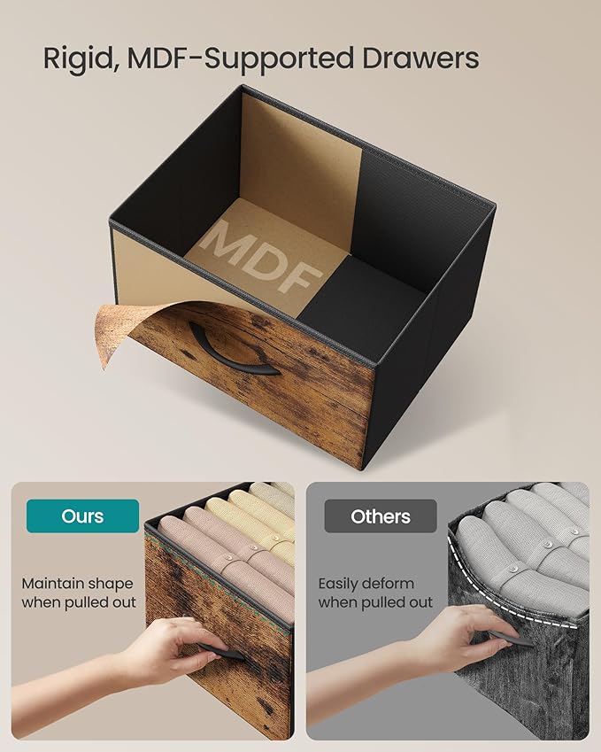 - Stability and Safety Ensured: This fabric dresser comes with adjustable feet to prevent wobbles on slightly uneven floors and an anti-tip kit for safety, ensuring peace of mind