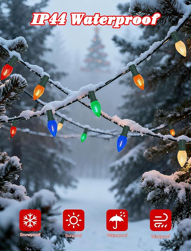 - Energy Save & Touch Safety: Each LED bulb in the outside christmas lights has a low energy consumption of 0.6W, effectively saving electricity costs and making the bulbs less prone to overheating. The c7 christmas lights has passed the UL certification test and is touch safe.