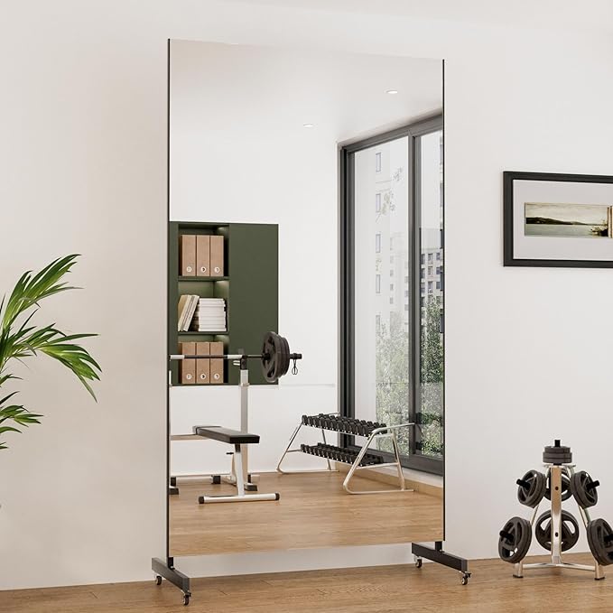 - 360° Mobility with Locking Stands: Large gym mirror with Stands features smooth-rolling casters for effortless 360° repositioning. Locking mechanisms secure it in place on any floor surface – ideal for dynamic spaces like gym mirrors or dance studios True-to-Life Reflection: Full body mirror with optical grade glass delivering razor-sharp, distortion-free imaging – see yourself with zero warping, ghosting, or blurring for accurate styling, fitness checks, or dance rehearsals