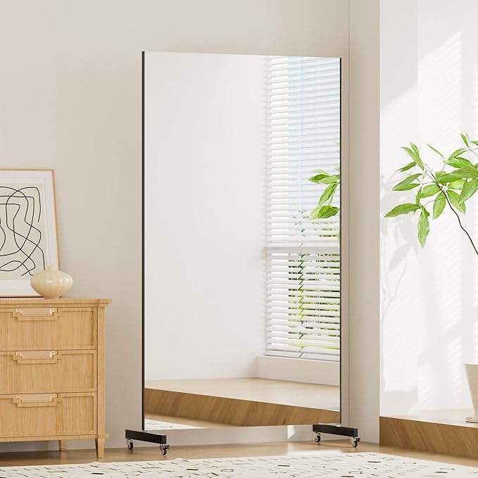 - 360° Mobility with Locking Stands: Large gym mirror with Stands features smooth-rolling casters for effortless 360° repositioning. Locking mechanisms secure it in place on any floor surface – ideal for dynamic spaces like gym mirrors or dance studios True-to-Life Reflection: Full body mirror with optical grade glass delivering razor-sharp, distortion-free imaging – see yourself with zero warping, ghosting, or blurring for accurate styling, fitness checks, or dance rehearsals