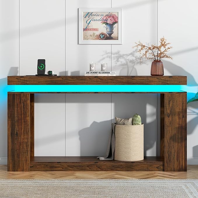 Loomie 63" Long Console Table with LED Lights & Power Outlet, 2-Tier Farmhouse Sofa Table Behind Couch with Storage, Narrow Entryway Tables with Heavy Duty Base for Living Room, Hallway (Brown)