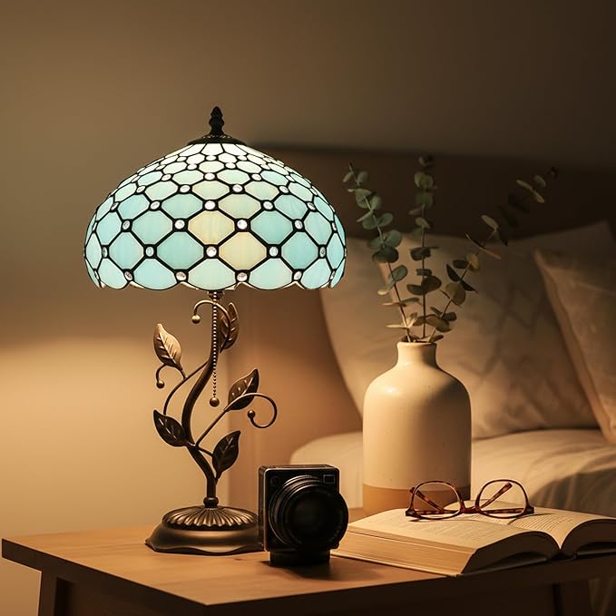 Tiffany Lamp Stained Glass Table Lamp Desk Bedside Reading Light 12X12X19 Inches with Metal Leaf Base(Sea Blue Beads)