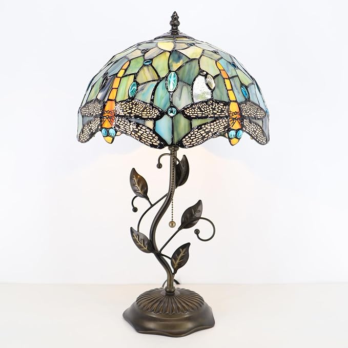 Tiffany Table Lamp, Stained Glass Style Desk Lamp, 12X12X19 Inch,Bedside Reading Light, Metal Leaf Base (Brown Dragonfly Style)