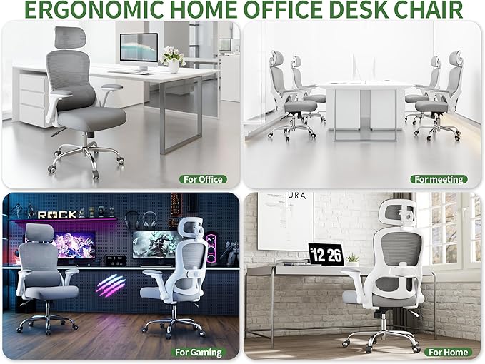 Ergonomic Office Chair - Computer Desk Chairs Comfy, Mesh High-Back Gaming Chair with Adjustable Lumbar Support, Executive Task Chair for Adults, Comfortable for Long Hours (White Grey)