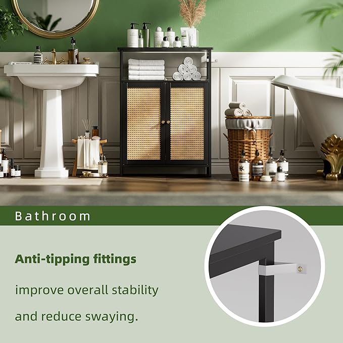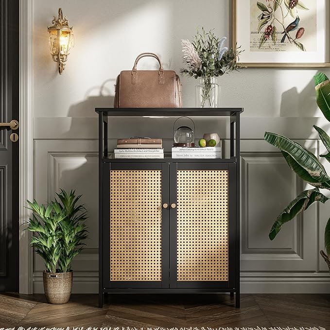 - VERSATILE FITS ANY SPACE: Rattan-accented bamboo cabinet storage that works everywhere. Use as bathroom floor cabinet, living room side table, kitchen buffet, entryway locker, bedroom sideboard. Stow toiletries, arrange décor/books, sort kitchen supplies, tidy shoes/bags. Adapts seamlessly, solves clutter