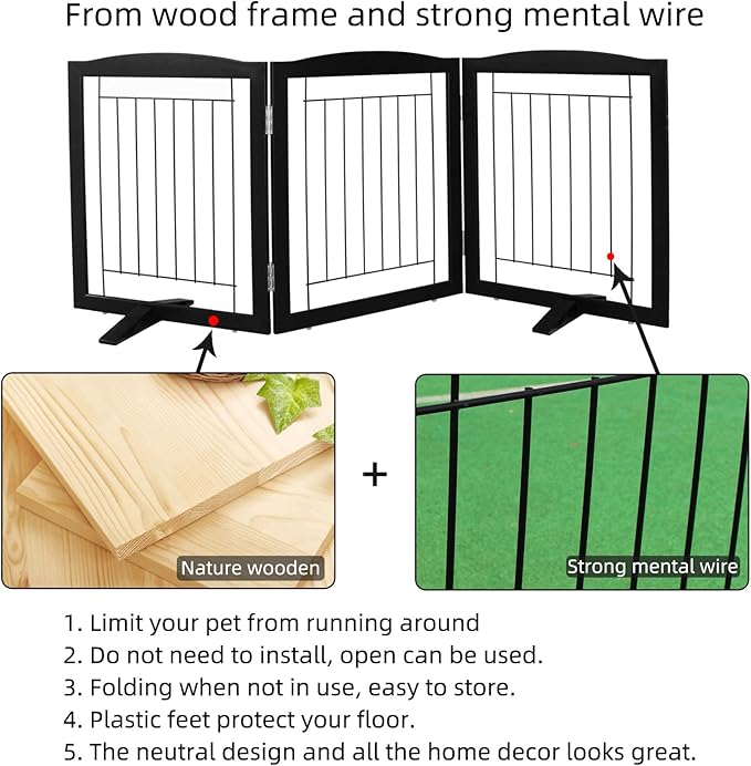 ZJSF Freestanding Dog Fence Indoor, Foldable Dog Gate for Doorways, Stairs or Hallways, Sturdy Wood Extra Wide Pet Gate with Support Feet for The House, Black, 24 "Height-3 Panels