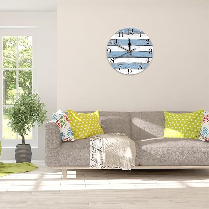 Coastal Country Wooden Wall Clock Battery Operated 10 in Round Wall Clocks Slilent Non Ticking Quartz Analog Clock for Bedroom Kids Living Room Classroom Decor