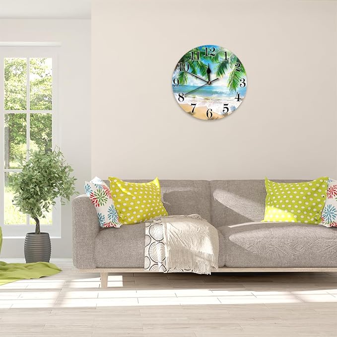 Tropical Beach Coconut Tree Wall Clock Battery Operated 10 in Round Wall Clocks Slilent Non Ticking Quartz Analog Clock for Bedroom Kids Living Room Classroom Decor