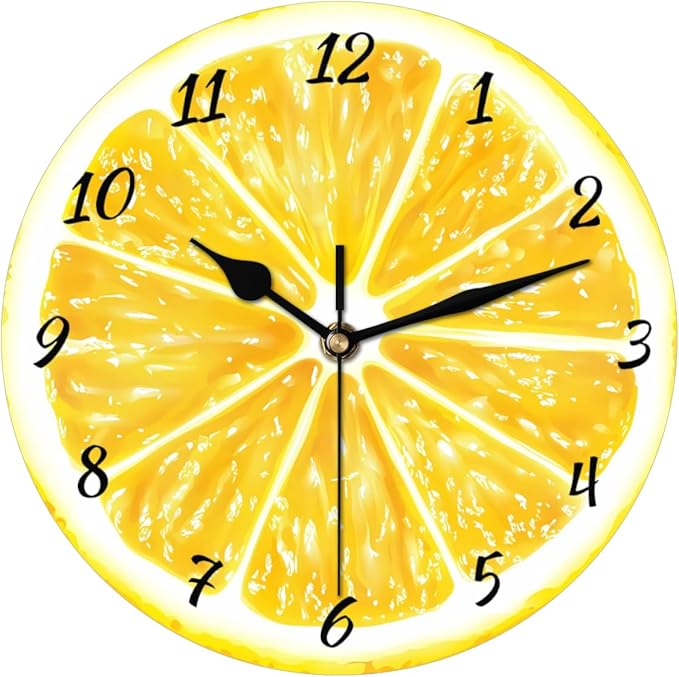 Yellow Lemon Wall Clock Battery Operated 10 in Round Wall Clocks Slilent Non Ticking Quartz Analog Clock for Bedroom Kids Living Room Classroom Decor
