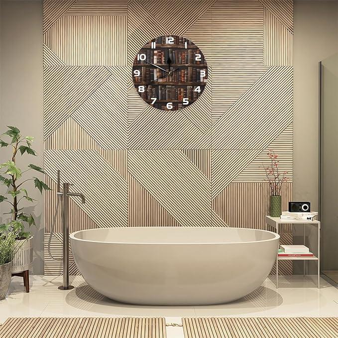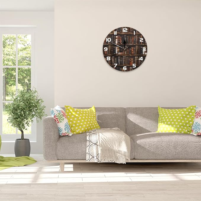 Retro Bookshelf Books Wallpaper Wall Clock Battery Operated 10 in Round Wall Clocks Slilent Non Ticking Quartz Analog Clock for Bedroom Kids Living Room Classroom Decor
