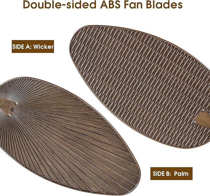 - Dual-sided Fan Blade Design - This tropical ceiling fan features thickened ABS dual-sided blades with palm leaf and wicker textures, effortlessly complementing modern, rustic, or tropical-themed decor.