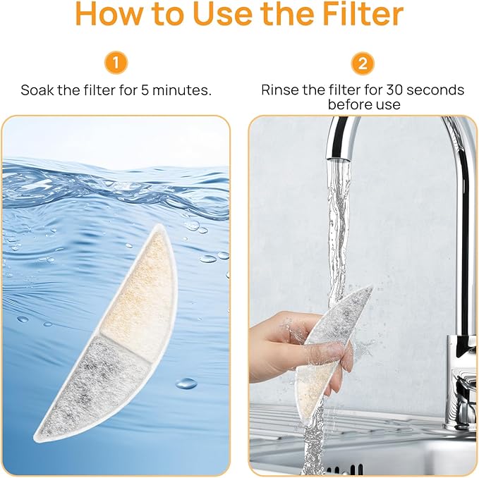 - 【Optimal Usage Instructions】Soak the filter for 5 minutes and rinse for 30 seconds before use. To ensure peak performance, replace filters every 2-4 weeks. For households with multiple pets, we recommend cleaning the fountain and changing the filter more frequently