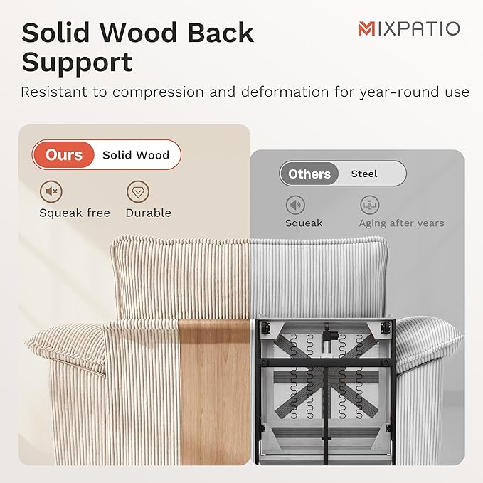 - The solid wood frame offers robust support while remaining lightweight for easy moving. The 4.33-inch-tall legs are equipped with scratch-proof, silent feet to protect your floors, and their elevated design allows robot vacuums to clean underneath effortlessly. Wide armrest pillows on both sides provide a comfortable spot to rest your arms, blending support with relaxation