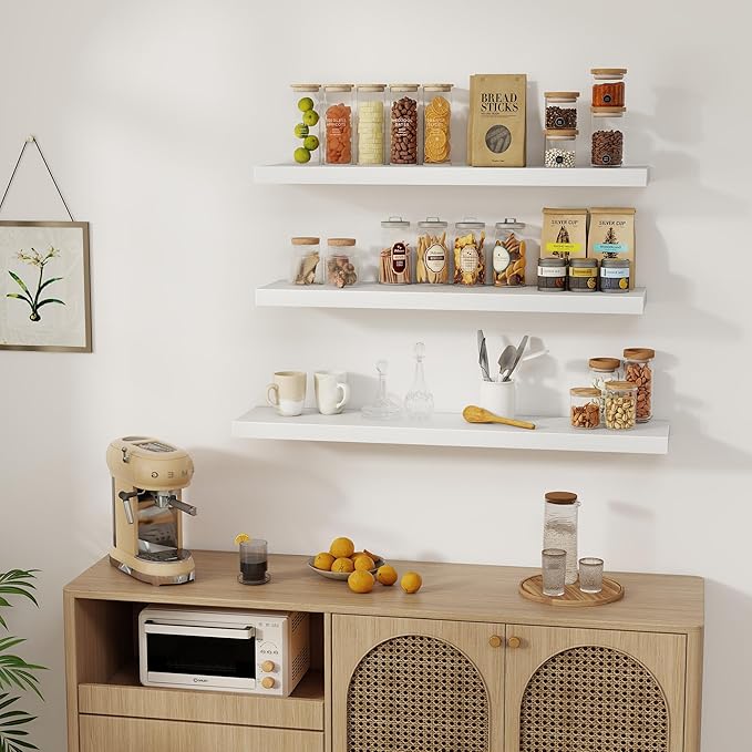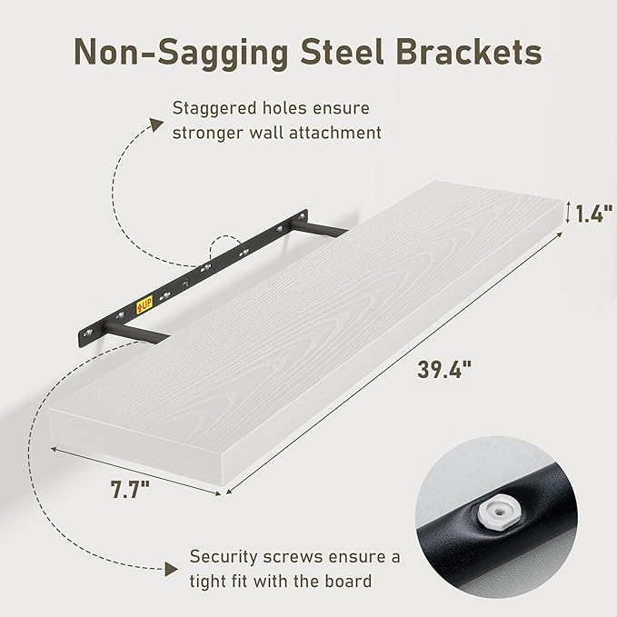 - 40 Inch Floating Shelves for Wall (Set of 2): Each wall shelves are 8 inches in depth and 1.4 inches in thickness. 2-piece set is more cost-effective and practical. Our wall shelf can be used in combination, staggered high or low on the wall, or mounted side-by-side to provide extra storage space for organizing small items and clutter in multiple areas such as kitchens, bathrooms, and bedrooms, creating a clean and smooth look. Multiple colors available