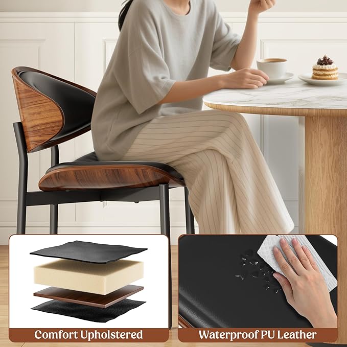 Dining Chairs Set of 2, Mid-Century Modern Upholstered PU Leather Chairs with Walnut Bentwood Back and Metal Legs Adjustable Feet for Kitchen Dining Room, Black PU