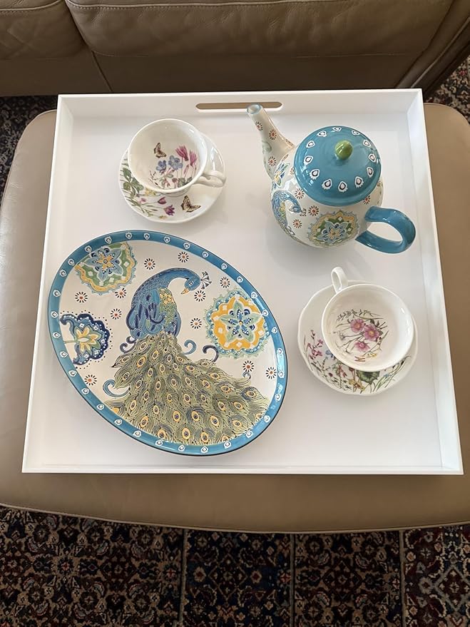 Glossy White Acrylic Serving Tray with Handles-Butler Trays for Coffee Table, Snacks,Breakfast in Bed, Kitchen Countertop,Vanity,Makeup Organizer,Ottoman (White, 20x20 Inch)