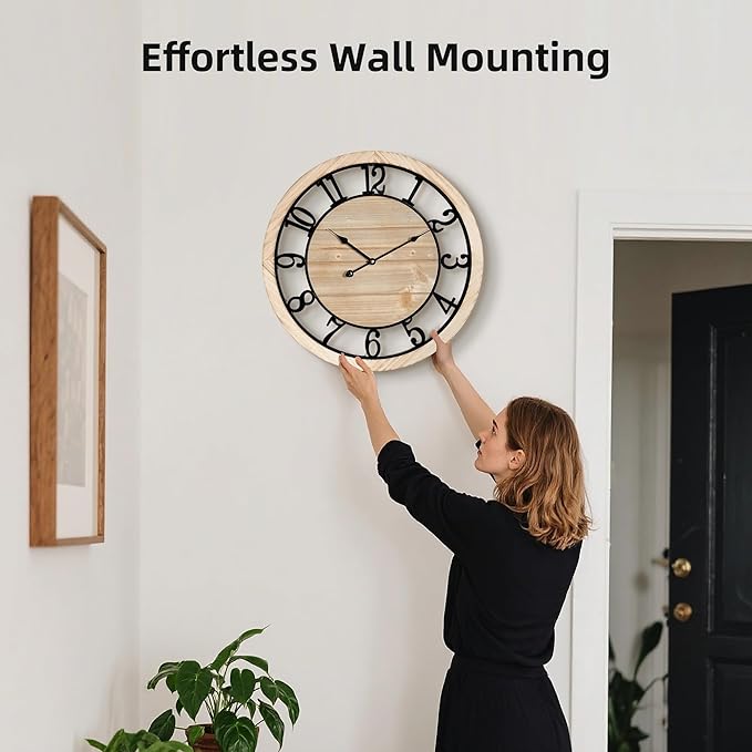 - 【Rustic Design with Wood and Metal Materials】 - Crafted with a real wooden frame and sturdy metal details, this farmhouse wall clock blends rustic charm with modern durability. Available in 4 sizes and 2 hand styles—Roman and Arabic numerals—you’ll find the perfect fit for any room. Please measure your wall space BEFORE PURCHASE to ensure the right size.