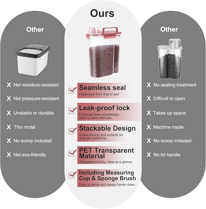 - FRESH SEALED CONTAINER:The dog food container is double-sealed with press-type snaps and silicone sealing gasket. The slot design keeps the food from moisture. There are four snaps on the side of the sealing cover, which provides excellent sealing and ensures Food freshness and freedom from moisture, dust and pests.