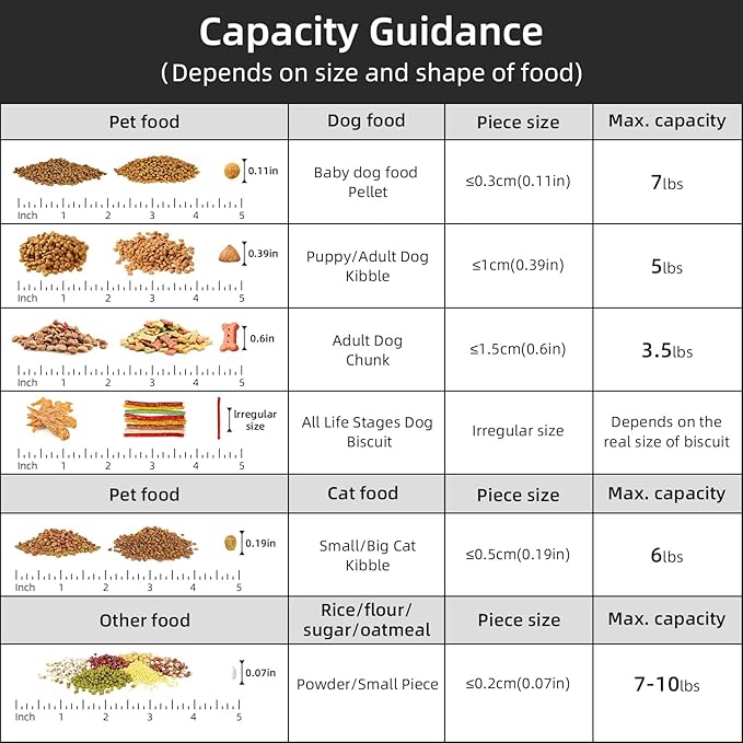 - MULTI-PUrRPOSE STORAGE:Our pet food container is suitable for storing dog food、cat food、bird seed、fish food、rice、 dry food、cereals、oats、cat litter 、flour and other large and small grains, as well as washing powder used at home. It is also a good choice.