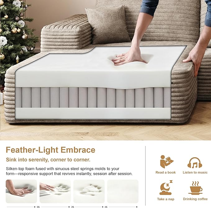 - Plush Corduroy Fabric:Feel the difference with our plush corduroy fabric, as soft as a hug from your favorite blanket. The rich texture and subtle sheen of this cloud couch elevate your living space, offering a tactile experience that pampers you. Cozy up and embrace the warmth and softness all year long with our modular sectional sofa.