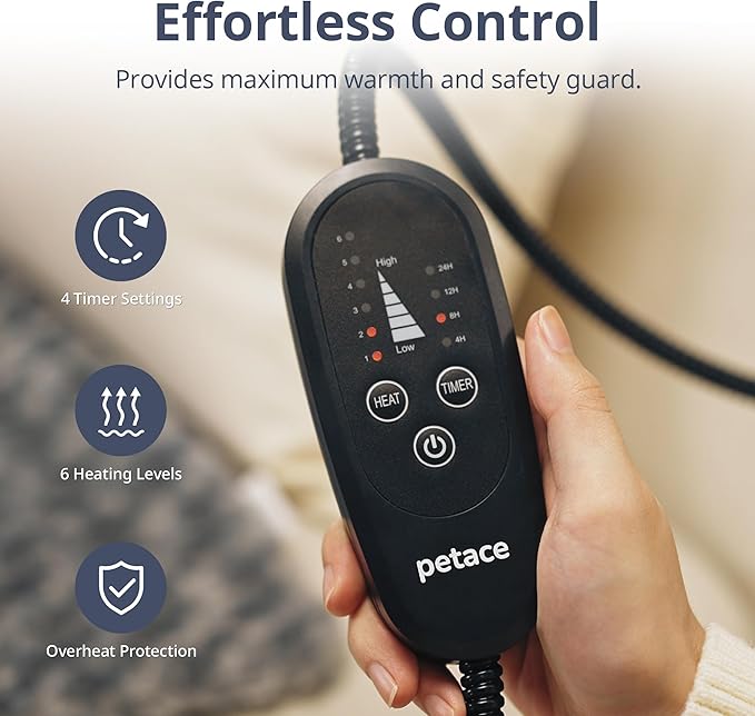 - Hassle-Free Control: Set temp from 6 heat levels (approx 86°F - 131°F) and auto-off function for safety via 4 timer options