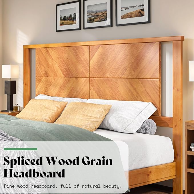 - Aesthetic Bed Frame: This solid wood bed frame features a rustic style, the wood grain design on the headboard adds elegance and visual interest. This simple yet warm aesthetic fits in with any bedroom decor.