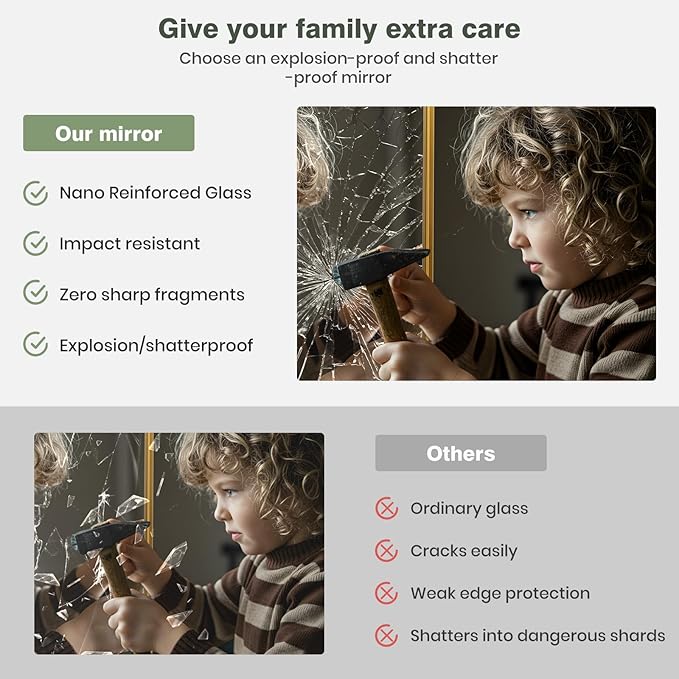 - High-quality and Safer Mirror: The rectangular wall mirror is assembled with a crystal clear glass for sharp image. Upgrade Nano mirror glass made with explosion-proof technology, even if the mirror is hit by an external force, it is rather unbreakable. The shatterproof film on the back of the mirror, no worry about sputtering damage in case the mirror is broken