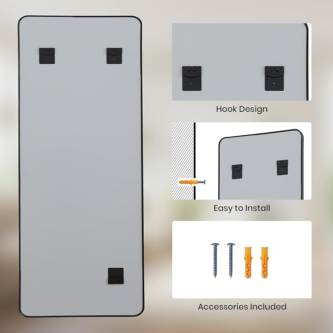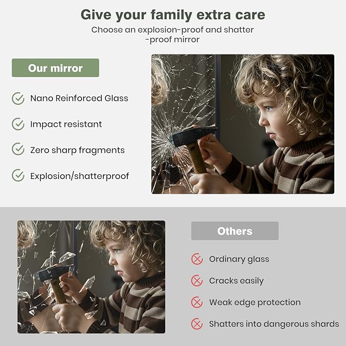 - High-quality and Safer Mirror: The rectangular wall mirror is assembled with a crystal clear glass for sharp image. Upgrade Nano mirror glass made with explosion-proof technology, even if the mirror is hit by an external force, it is rather unbreakable. The shatterproof film on the back of the mirror, no worry about sputtering damage in case the mirror is broken